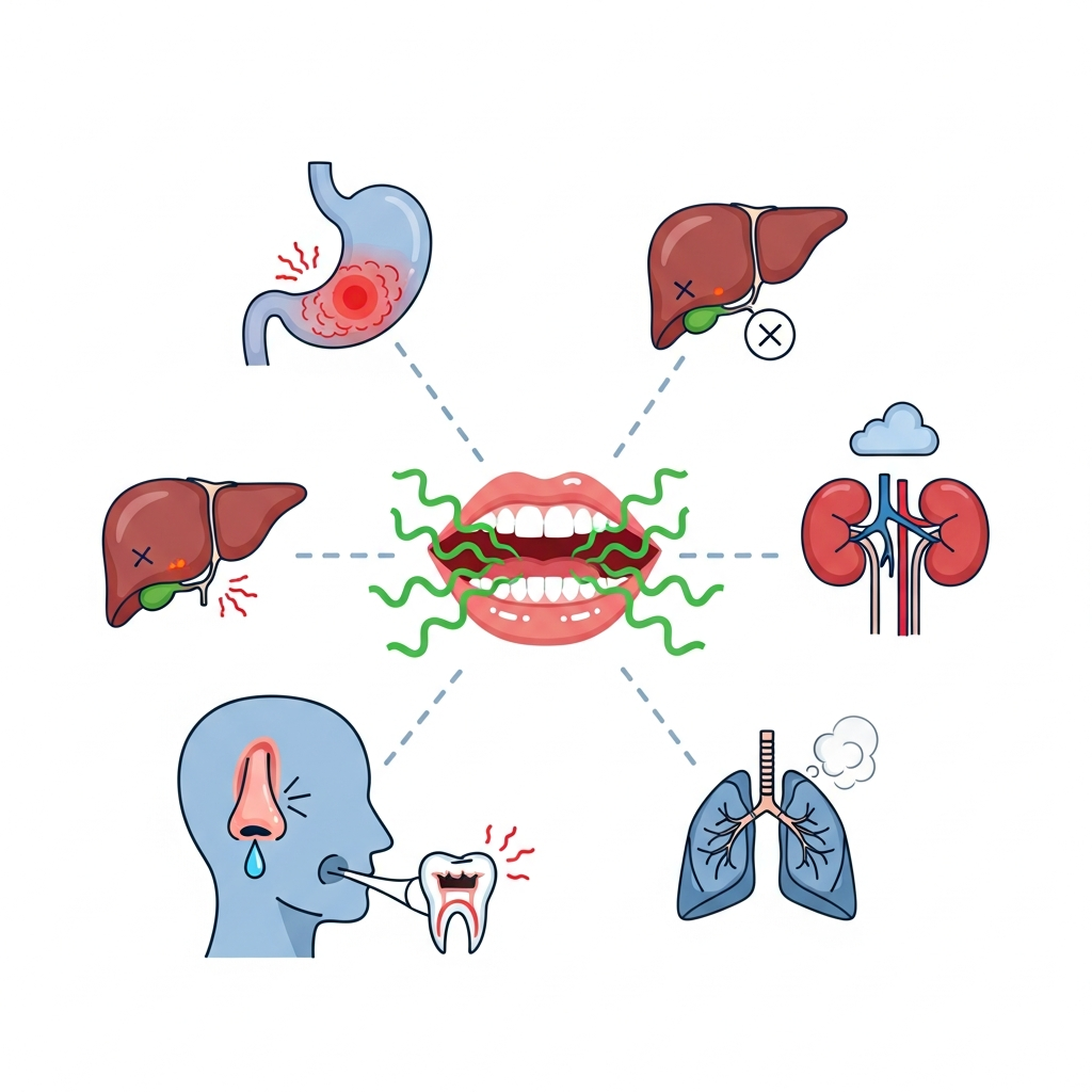 Diabetes bad breath can produce a fruity or acetone-like smell due to ketones in the breath. Additionally, liver disease bad breath creates a musty odor as toxins accumulate in the body. These serious conditions require immediate medical attention beyond dental care.